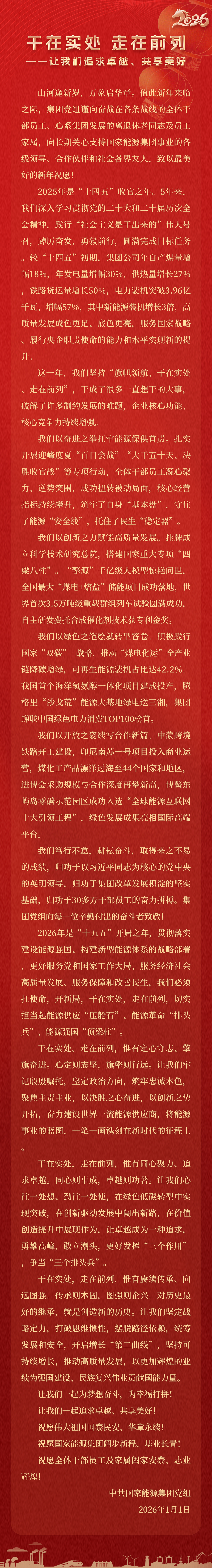 國家能源集團胸懷“國之大者”,增產增供、穩(wěn)價穩(wěn)市,積極服從服務國家戰(zhàn)略、保障國家能源安全、助力國民經濟穩(wěn)增長,推動煤炭安全綠色智能、煤電清潔高效穩(wěn)定、現代煤化工高端多元低碳、運輸物流協同一體、新能源多元創(chuàng)新規(guī)模化發(fā)展,全力擔當能源強國頂梁柱,能源供應壓艙石,能源革命排頭兵。